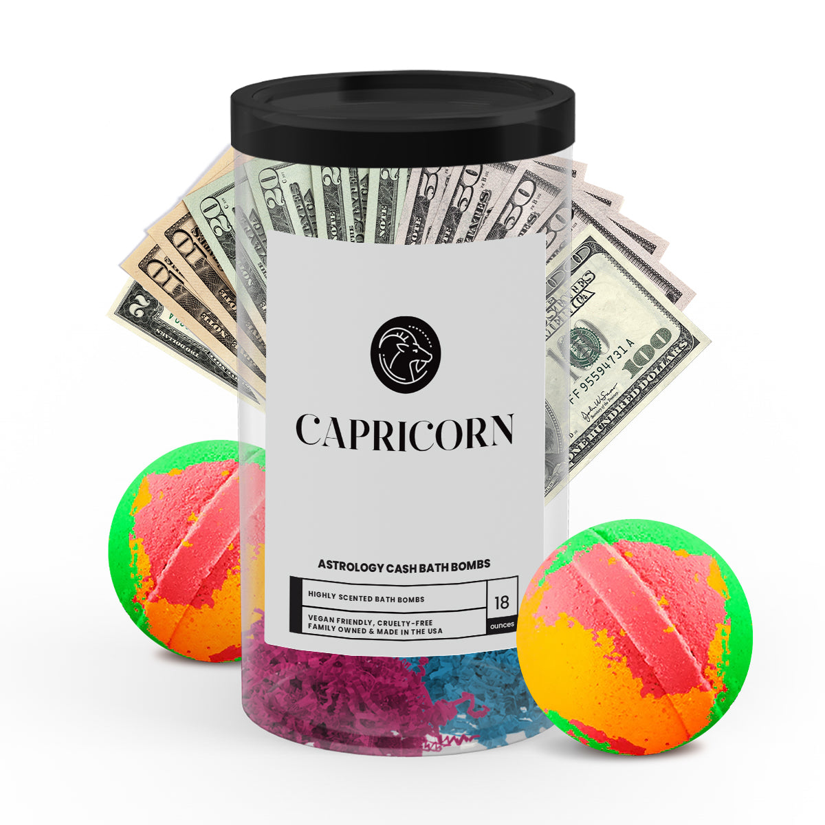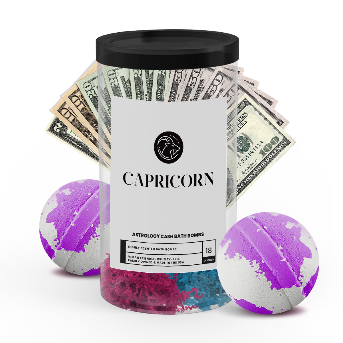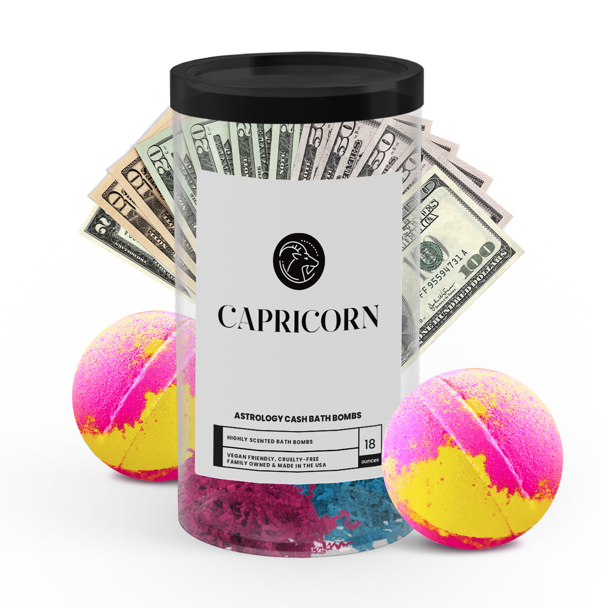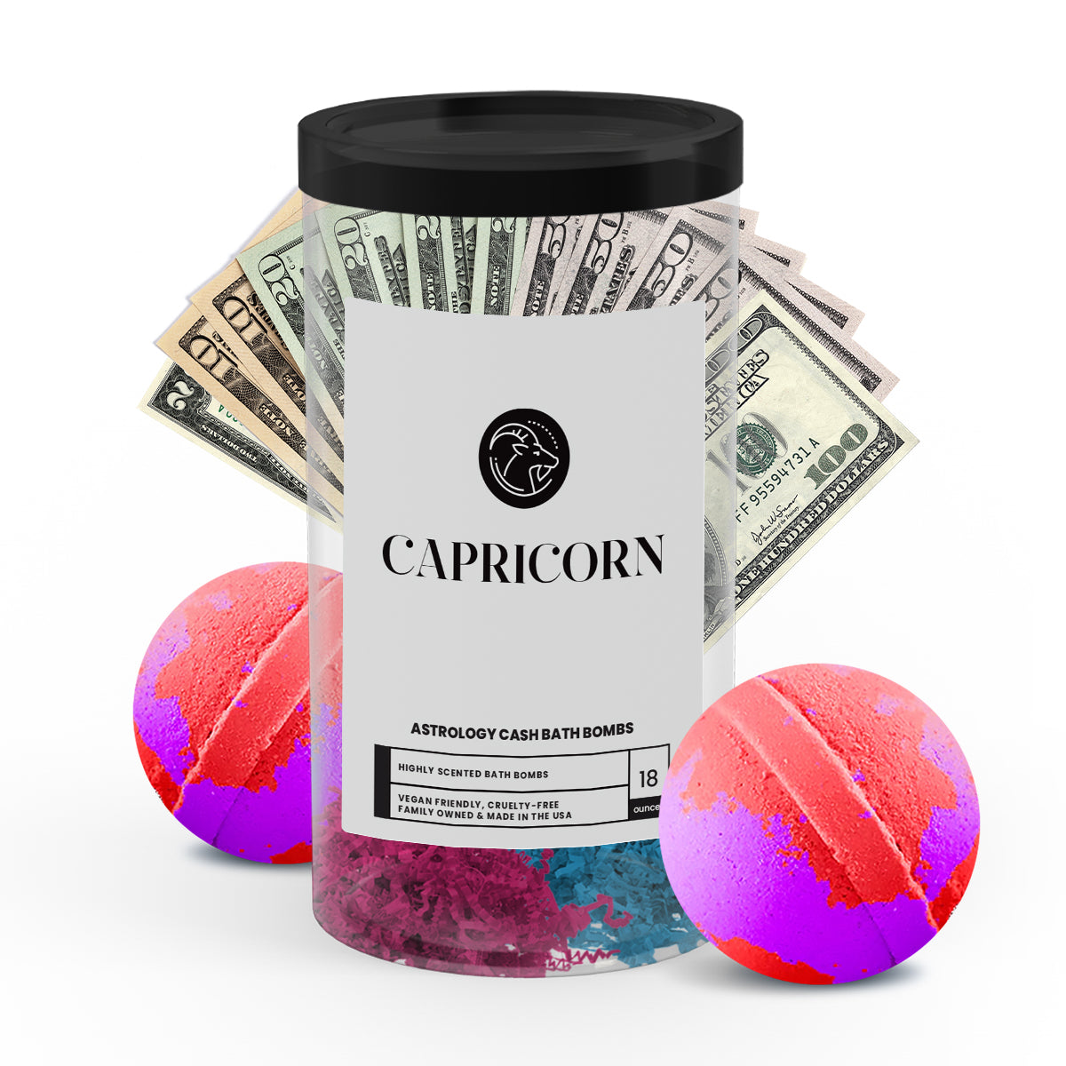 Discover the ultimate gift for your astrology-loving friend or loved one with our popular Capricorn Zodiac Cash Bath Bombs! With a real $2 bill hidden inside each bath bomb and randomized cash prizes of up to $2500, our Zodiac Cash Bath Bombs are a fun and exciting way to add a little extra luxury to your self-care routine.