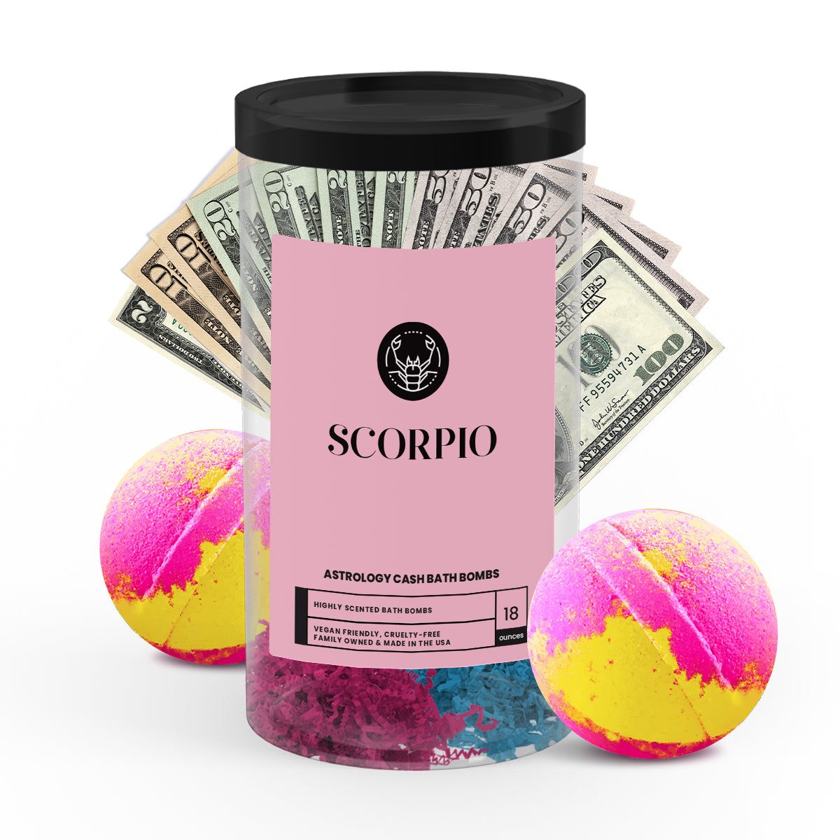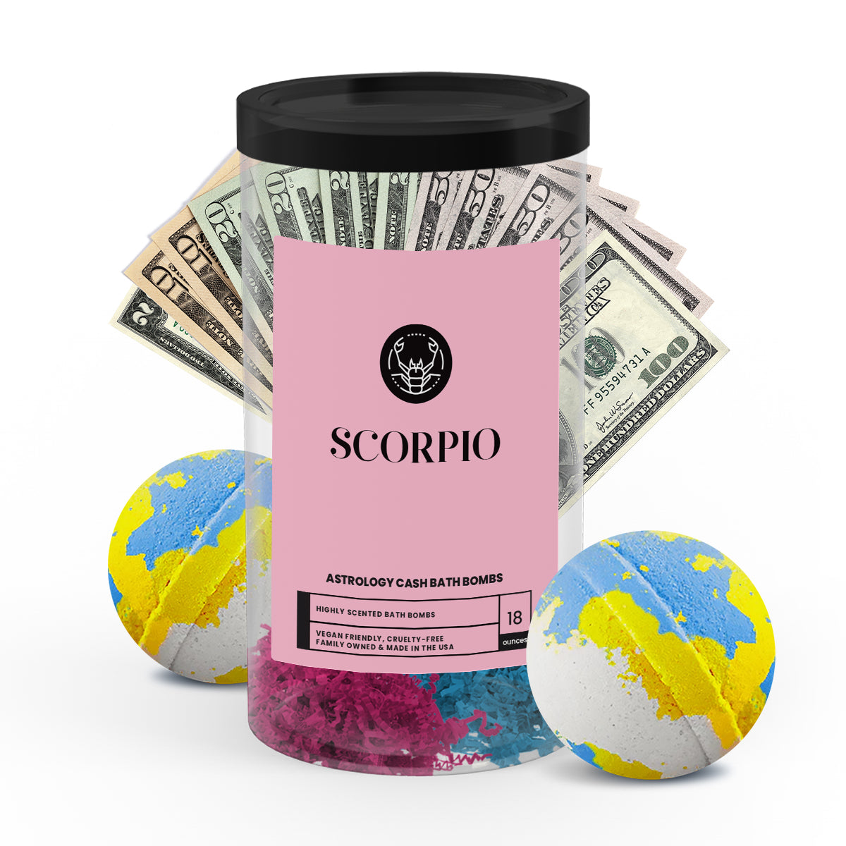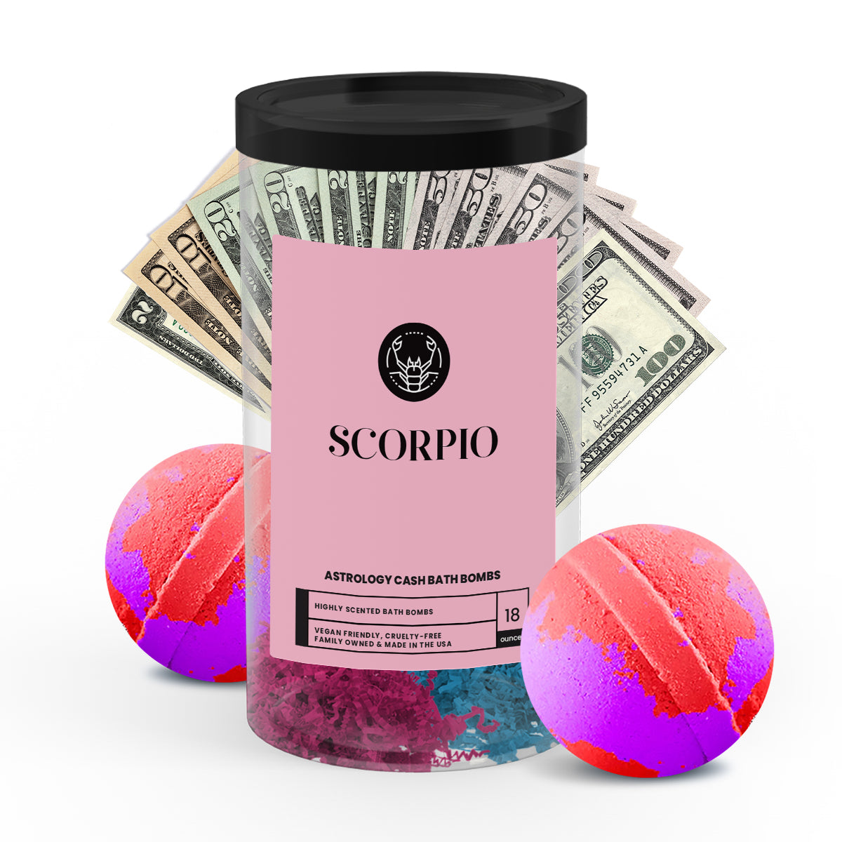 Discover the ultimate gift for your astrology-loving friend or loved one with our popular Scorpio Zodiac Cash Bath Bombs! With a real $2 bill hidden inside each bath bomb and randomized cash prizes of up to $2500, our Zodiac Cash Bath Bombs are a fun and exciting way to add a little extra luxury to your self-care routine.