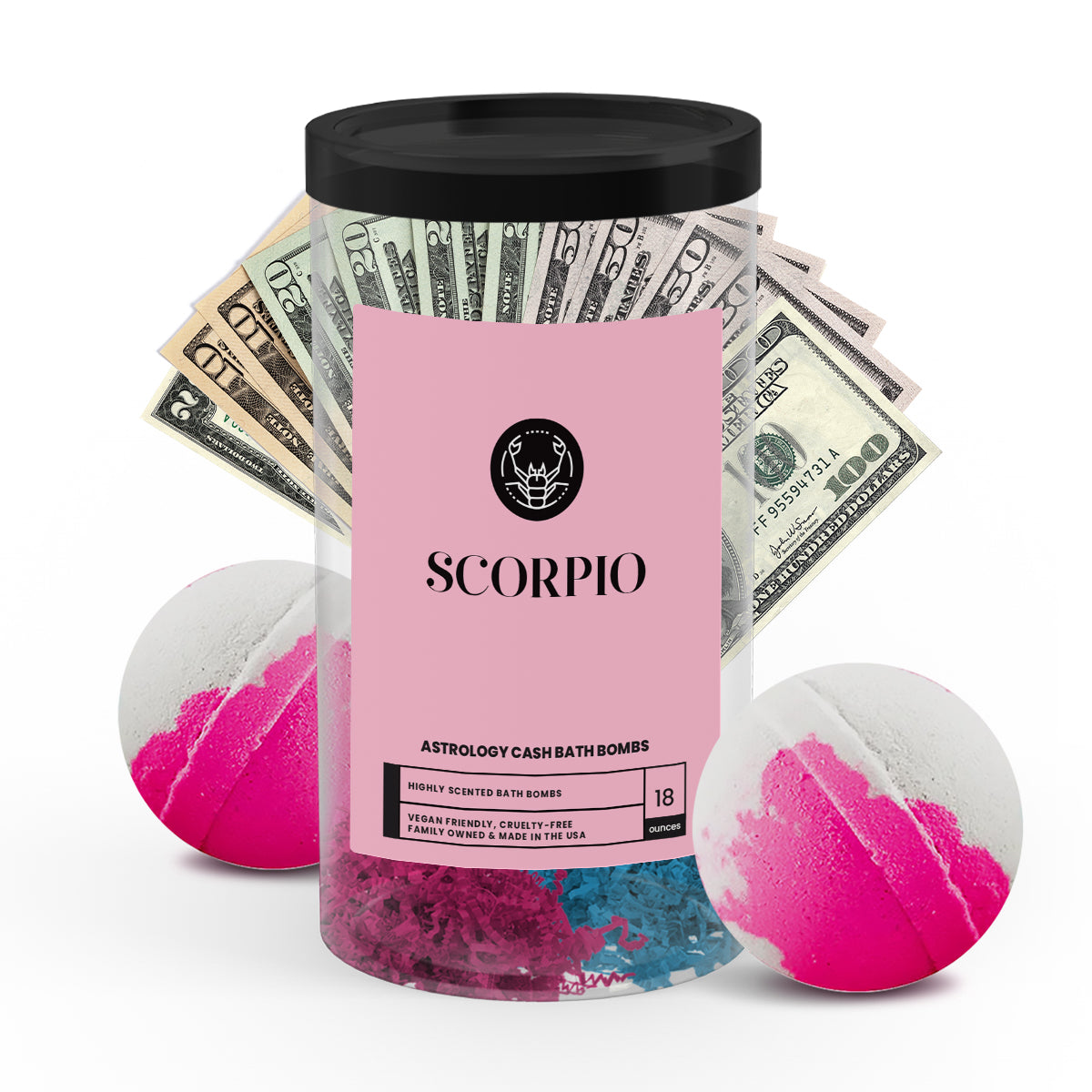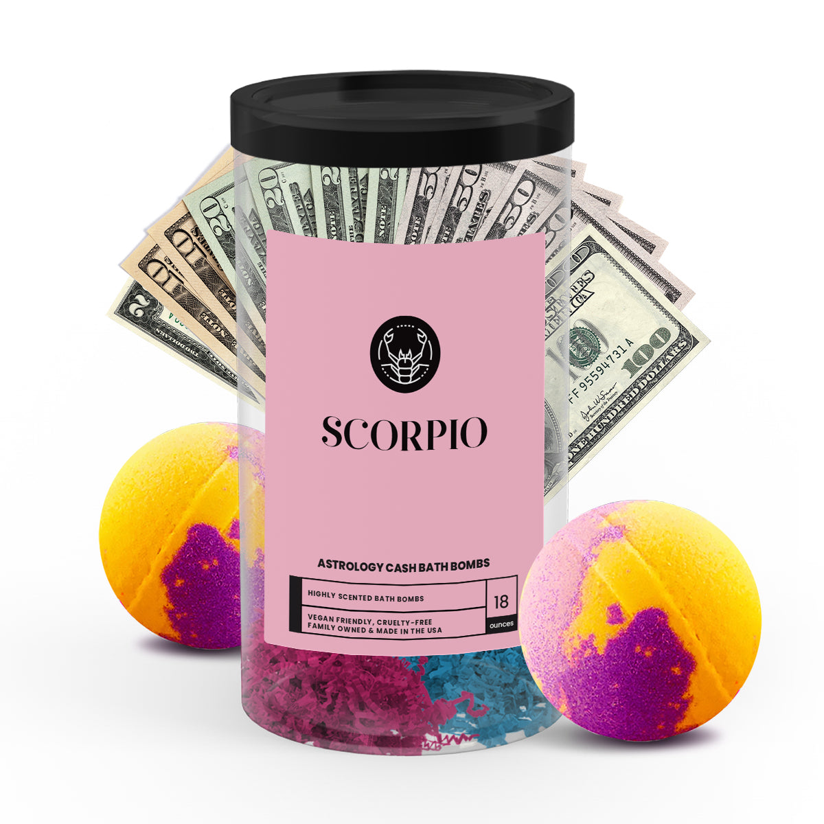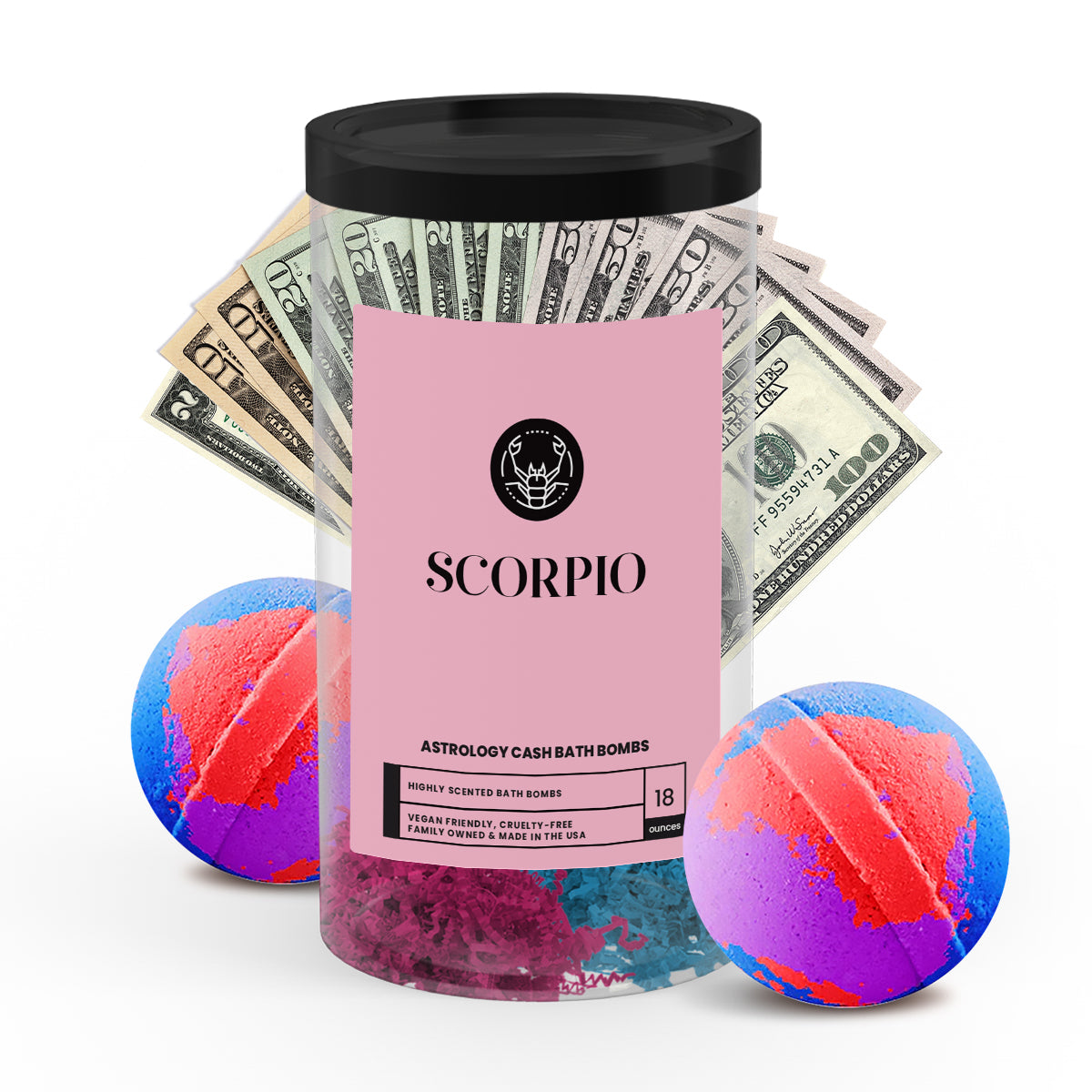 Discover the ultimate gift for your astrology-loving friend or loved one with our popular Scorpio Zodiac Cash Bath Bombs! With a real $2 bill hidden inside each bath bomb and randomized cash prizes of up to $2500, our Zodiac Cash Bath Bombs are a fun and exciting way to add a little extra luxury to your self-care routine.