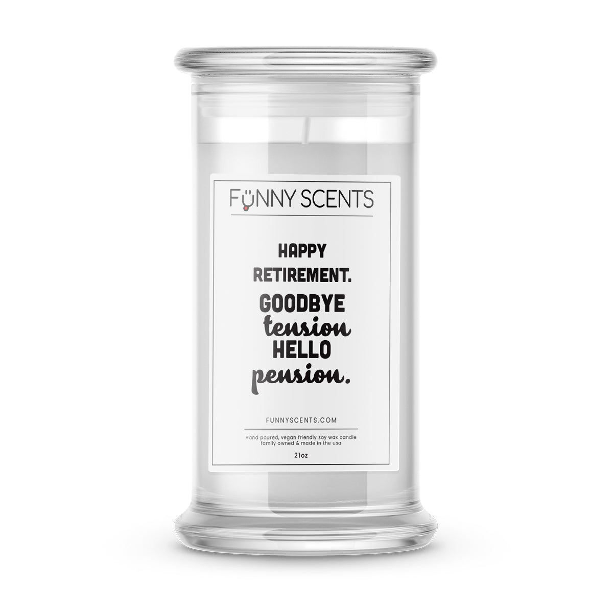 Happy Retirement. Goodbye Tension Hello pension. Funny Candles