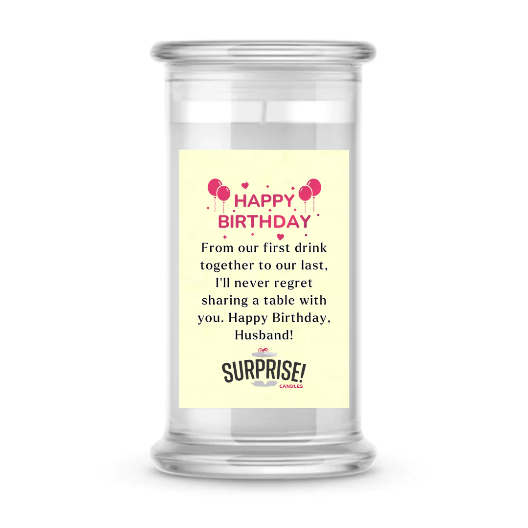 FROM OUR FIRST DRINK TOGETHER TO OUR LAST, I'LL NEVER REGRET SHARING A TABLE WITH YOU. HAPPY BIRTHDAY HUSBAND! HAPPY BIRTHDAY CANDLE