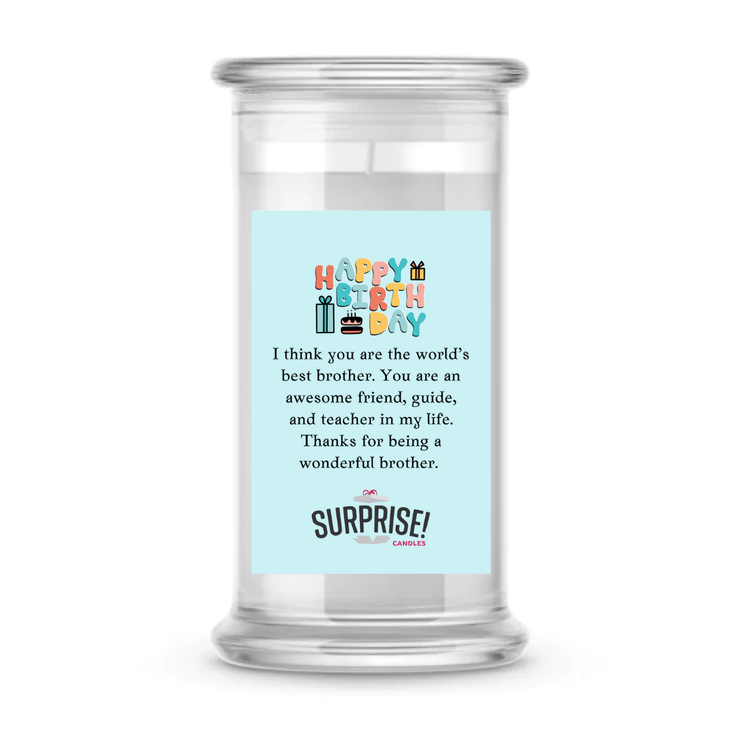 I THINK YOU ARE THE WORLD'S BEST BROTHER, YOU ARE AN AWESOME FRIEND, GUIDE AND TEACHER IN MY LIFE. THANKS FOR BEING A WONDERFUL BROTHER. HAPPY BIRTHDAY CANDLE