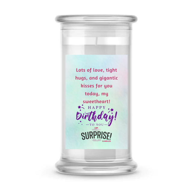 LOTS OF LOVE, TIGHT HUGS, AND GIGANTIC KISSES FOR YOU TODAY, MY SWEETHEART HAPPY BIRTHDAY CANDLE is backordered and will ship as soon as it is back in stock.
