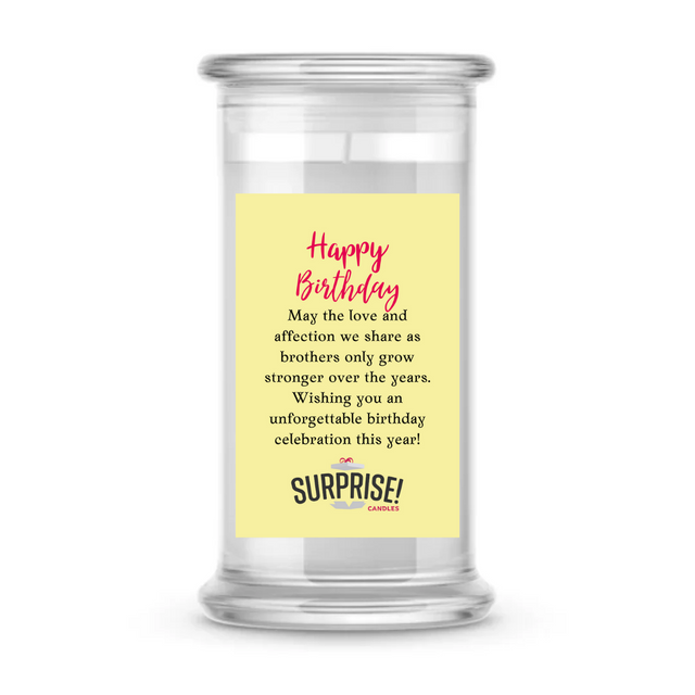 MAY THE LOVE AND AFFECTION WE SHARE AS BROTHERS ONLY GROW TRONGER OVER THE YEARS. WISHING YOU AN UNFORGETTABLE BIRTHDAY CELEBRATION THIS YEAR! HAPPY BIRTHDAY CANDLE is backordered and will ship as soon as it is back in stock.