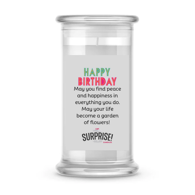 MAY YOU FIND PEACE AND HAPPINESS IN EVERYTHING YOU DO. MAY YOUR LIFE BECOME A GARDEN OF FLOWERS! HAPPY BIRTHDAY CANDLE