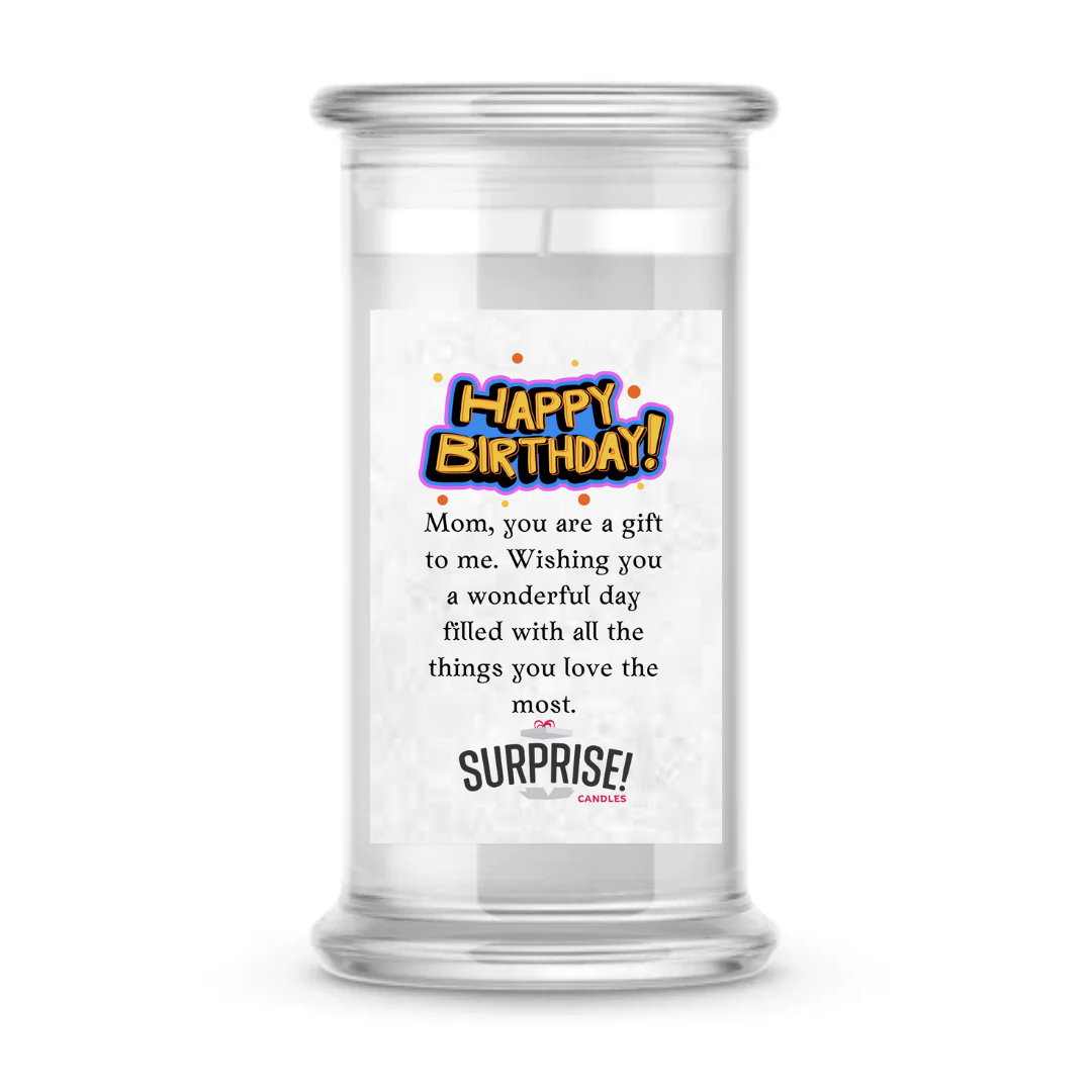 MOM, YOU ARE A GIFT TO ME. WISHING YOU A WONDERFUL DAY FILLED WITH ALL THE THINGS YOU LOVE THE MOST. HAPPY BIRTHDAY CANDLE
