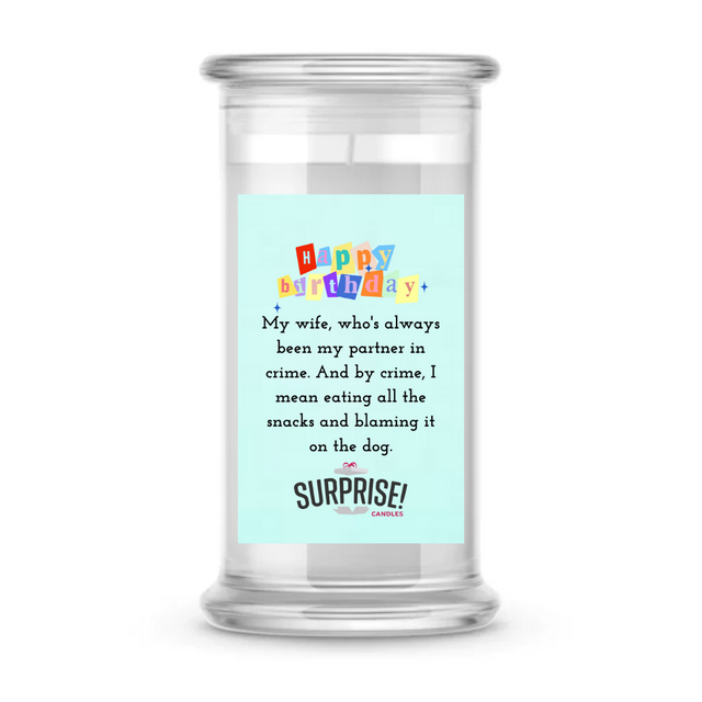 MY WIFE, WHO'S ALWAYS BEEN MY PARTNER IN CRIME, AND BY CRIME. I MEAN EATING ALL THE SNACKS AND BLAMING IT ON THE DOG. HAPPY BIRTHDAY CANDLE