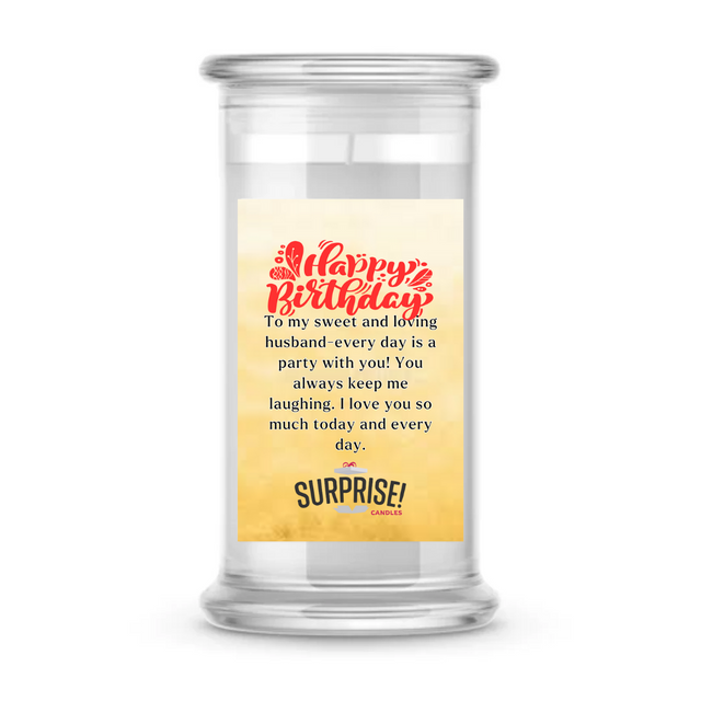TO MY SWEET AND LOVING HUSBAND-EVERYDAY IS A PARTY WITH YOU! YOU ALWAYS KEEP ME LAUGHING. I LOVE YOU SO MUCH TODAY AND EVERY DAY. HAPPY BIRTHDAY CANDLE is backordered and will ship as soon as it is back in stock.