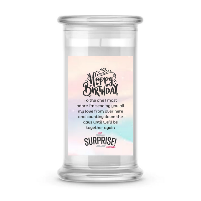 TO THE ONE I MOST ADORE. I'M SENDING YOU ALL MY LOVE FROM OVER HERE AND COUNTING DOWN THE DAYS UNTILL WE'LL BE TOGETHER AGAIN. HAPPY BIRTHDAY CANDLE is backordered and will ship as soon as it is back in stock.