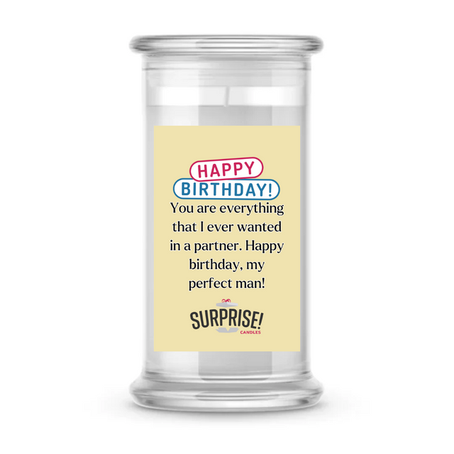 YOU ARE EVERYTHING THAT I EVER WANTED IN A PARTNER. HAPPY BIRTHDAY MY PERFECT MAN! HAPPY BIRTHDAY CANDLE is backordered and will ship as soon as it is back in stock.