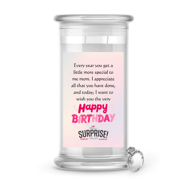 EVERY YEAR YOU GET A LITTLE MORE SPECIAL TO ME MOM. I APPRECIATE ALL THAT YOU HAVE DONE, AND TODAY, I WANT TO WISH YOU THE VERY HAPPY BIRTHDAY JEWELRY CANDLE