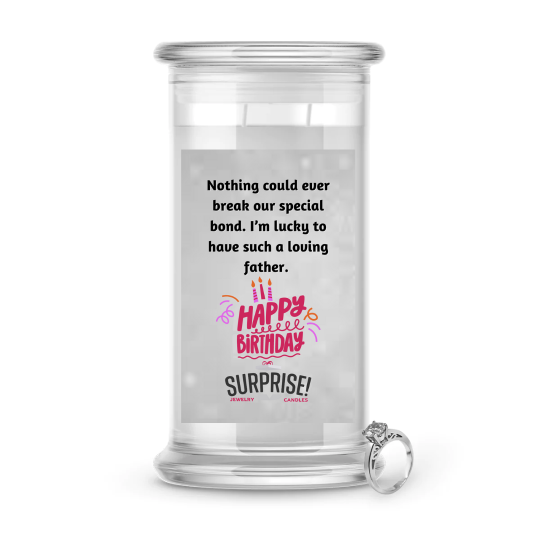NOTHING COULD EVER BREAK OUR SPECIAL BOND. I'M LUCKY TO HAVE SUCH A LOVING FATHER. HAPPY BIRTHDAY JEWELRY CANDLE