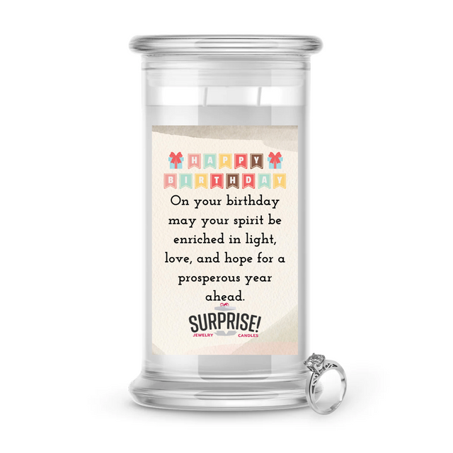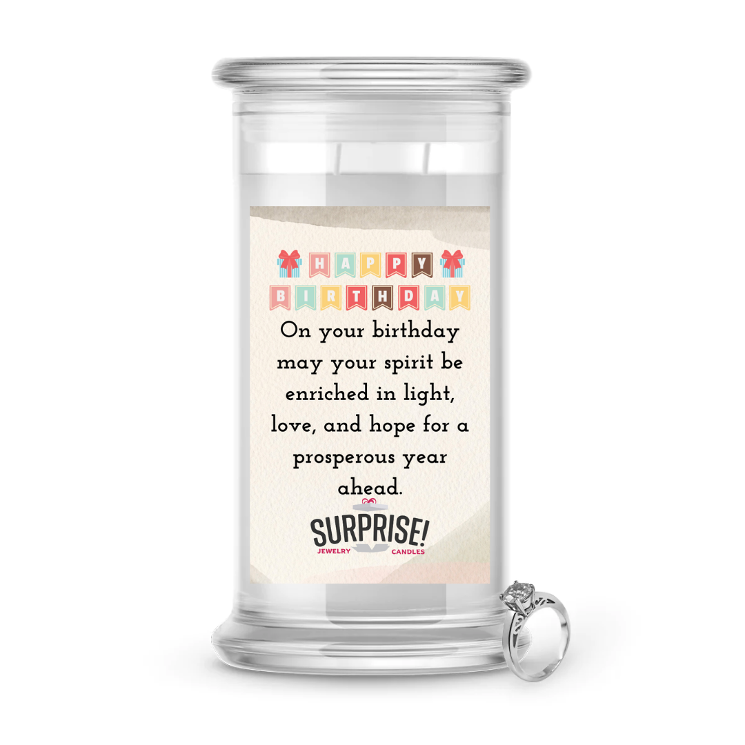 ON YOUR BIRTHDAY MAY YOUR SPIRIT BE ENRICHED IN LIGHT, LOVE, AND HOPE FOR A PROSSPEROUS YEAR AHEAD. HAPPY BIRTHDAY JEWELRY CANDLE