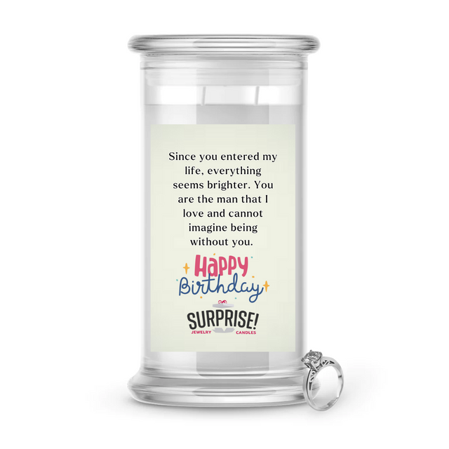 SINCE YOU ENTERED MY LIFE, EVERYTHING SEEMS BRIGHTER. YOU ARE THE MAN THAT I LOVE AND CANNOT IMAGINE BEING WITHOUT YOU. HAPPY BIRTHDAY JEWELRY CANDLE