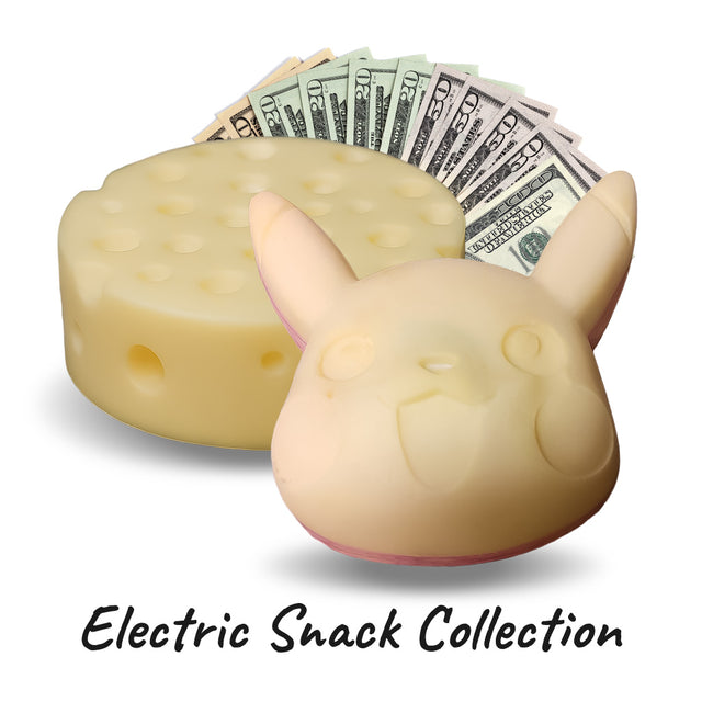 The Electric Snack Collection features two oversized Cash Wax Melts: the energetic Electric Critter Melt and the tasty-looking Cheese Wheel Melt — each weighing over half a pound and hiding REAL cash inside.