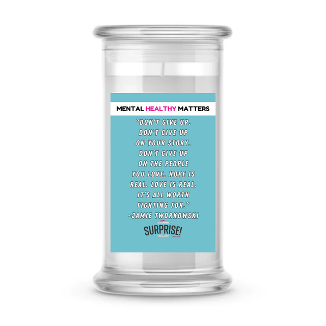 DON'T GIVE UP. DON'T GIVE UP ON YOUR STORY. DON'T GIVE UP ON THE PEOPLE YOU LOVE. HOPE IS REAL. LOVE IS REAL. IT'S ALL WORTH FIGHTING FOR. | MENTAL HEALTH CANDLES