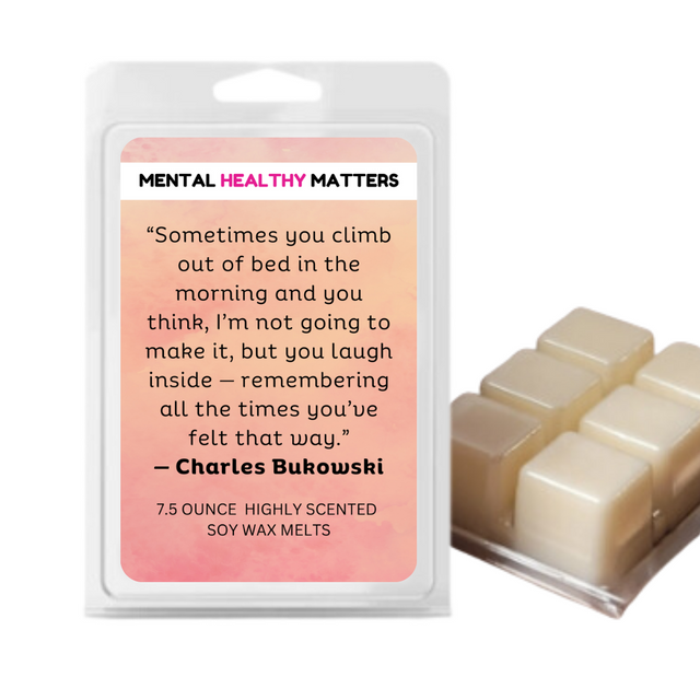 SOMETIMES YOU CLIMB OUT OF BED IN THE MORNING AND YOU THINK, I'M NOT GOING TO MAKE IT, BUT YOU LAUGH INSIDE - REMEMBERING ALL THE TIMES YOU'VE FELT THAT WAY - CHARLES BUKOWASI | MENTAL HEALTH WAX MELTS is backordered and will ship as soon as it is back in stock.