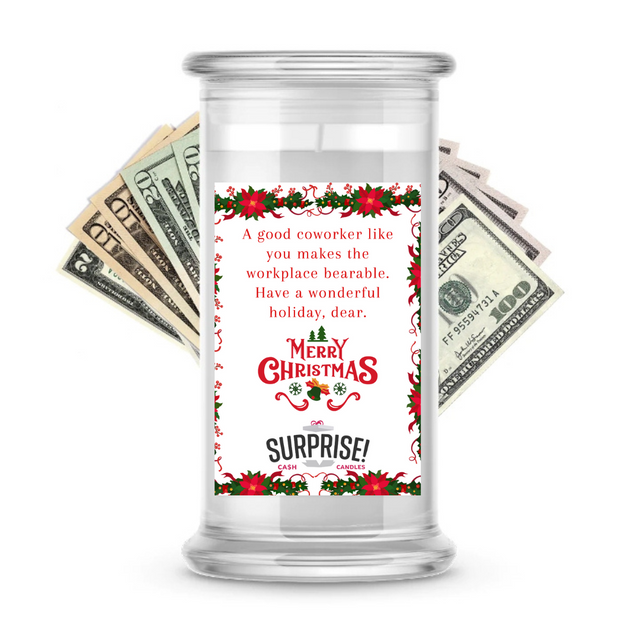 A GOOD COWORKER LIKE YOU MAKES THE WORKSPACE BEARABLE. HAVE A WONDERFUL HOLIDAY, DEAR. MERRY CHRISTMAS CASH CANDLE
