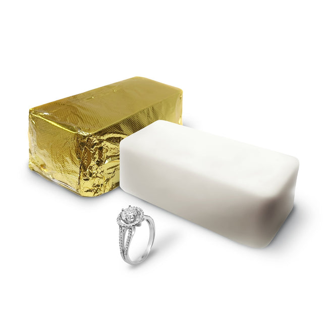 Our Giant Gold Bar Jewelry Wax Melts are sized at an average of 2 pounds, measuring 6 inches in length, 4 inches in width, and 4 inches in height. Each wax melt is intricately designed to resemble a gold bar, and the added bonus of a piece of jewelry inside makes this an exciting and unique experience for anyone.