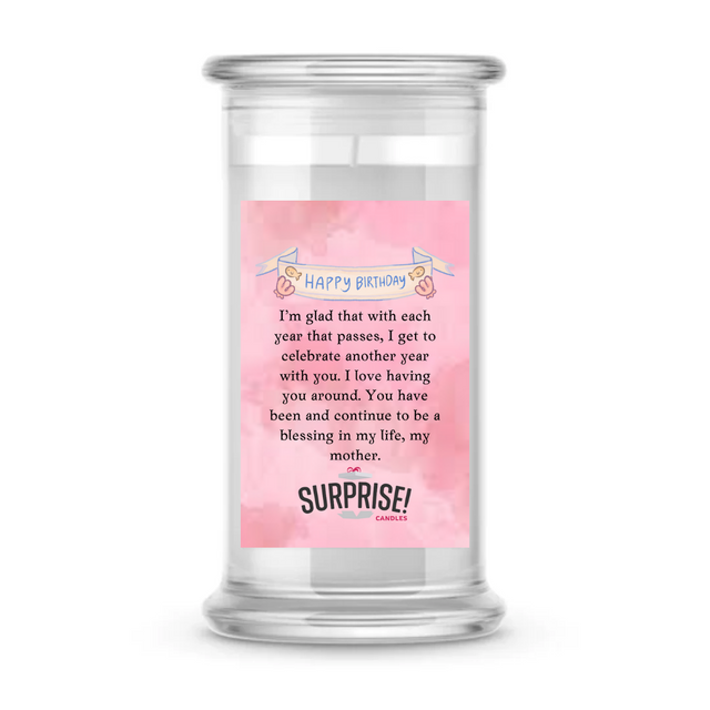 I'M GLAD THAT WITH EACH YEAR THAT PASSES. I GET TO CELEBRATE ANOTHER YEAR WITH YOU. I LOVE HAVING YOU AROUND. YOU HAVE BEEN AND CONTINUE TO BE A BLESSING IN MY LIFE, MY MOTHER. HAPPY BIRTHDAY CANDLE is backordered and will ship as soon as it is back in stock.
